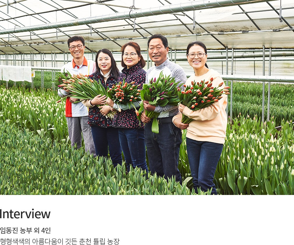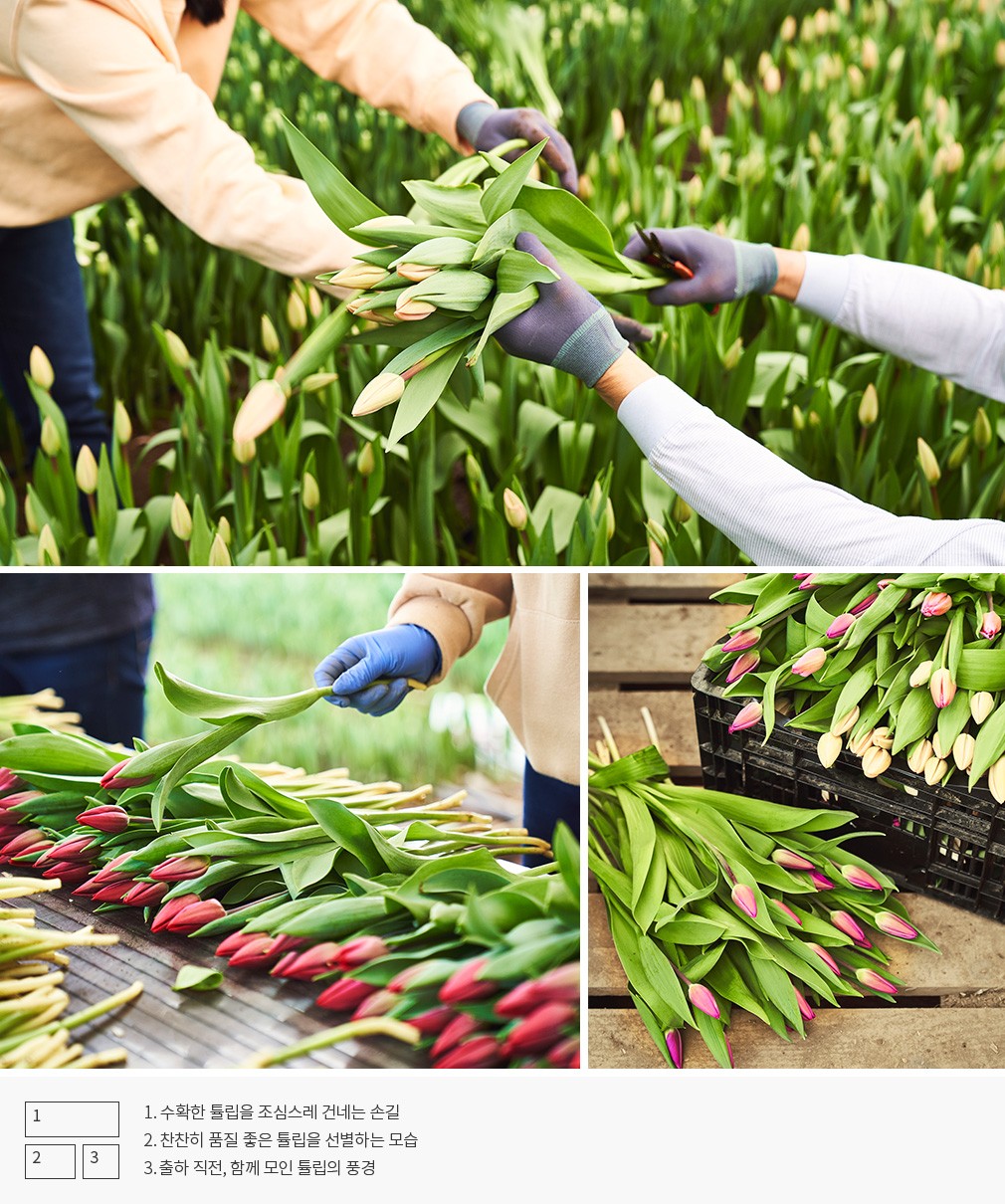'튤립'하면 노란색, 빨간색 등 몇 가지 색상만 떠올릴 텐데요. 사실 튤립은 품종이 약 1000여 종에 이르는 다채로운 꽃이에요. 저희 농장에서는 그중에서 33가지 종류의 튤립을 재배하고 있어요. 또한 색상별로, 품종별로 세심한 관리가 필요한 꽃이기도 합니다. 모두 저마다의 매력을 갖추고 있으니, 하나도 허투루 기를 수 없어요.