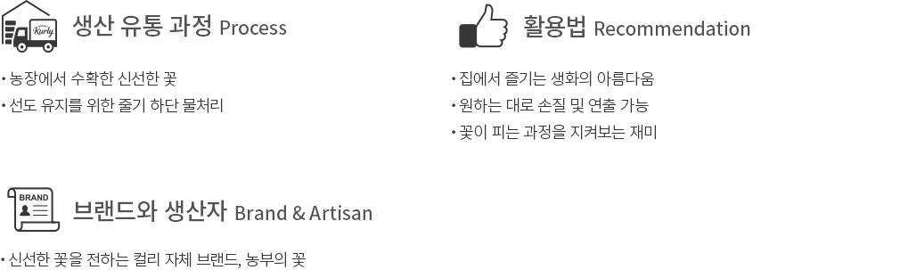 가격을 지불한 만큼 만족하실 수 있는 꽃을 드리고 싶어요. 꽃을 사치품처럼 즐기는 것보다는 일상 속에서 자연스럽게 누리셨으면 하고요. 좋은 품질의 꽃을 합리적인 가격에 전해드리고 싶은 마음이 클 수밖에 없지요. 매일 아침 싱싱하게 배송된 꽃이, 바쁜 일상에도 향기를 불어 넣어주기를 바랍니다.
