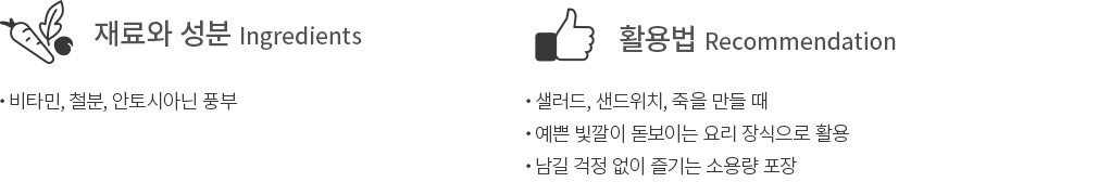 보관법 ・냉장 보관해 주세요. 물에 적신 키친타월을 줄기 부분에 덧댄 뒤 랩으로 감싸주면 더욱 싱싱하게 보관할 수 있어요.
