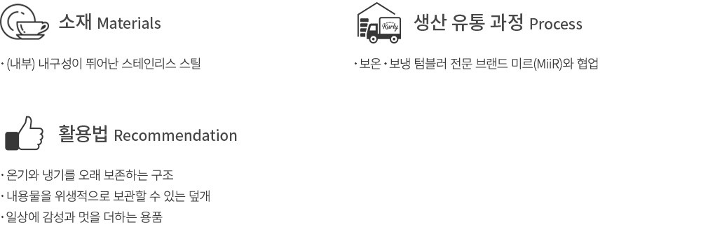 ・특징 : 내부가 스테인리스 스틸로 만들어져 보온과 보냉력이 우수한 머그입니다. 덮개가 포함되어 내용물을 위생적으로 보관할 수 있어요.