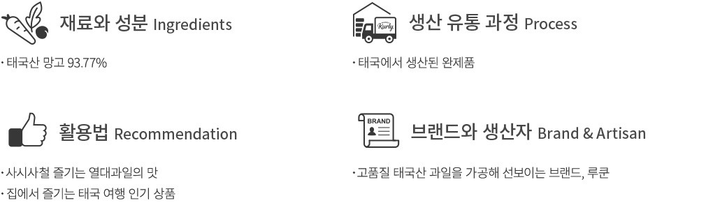 망고 본연의 달콤한 풍미를 살려 건조한 루쿤의 프리미엄 건망고를 소개할게요. 단맛이 강하고 과육이 풍부한 태국산 골든 망고를 엄선한 뒤, 자체 건조 기법을 통해 가공한 제품인데요. 질기지 않고 쫀득쫀득 기분 좋은 식감을 지녀, 가볍게 집어먹는 간식으로 안성맞춤이랍니다. 1봉에 망고 2개 분량을 큼직하게 썰어 담았으니 더욱 만족스러울 거예요. 태국 여행 필수품, 루쿤의 건망고를 이제 집에서 간편하게 만나보세요.