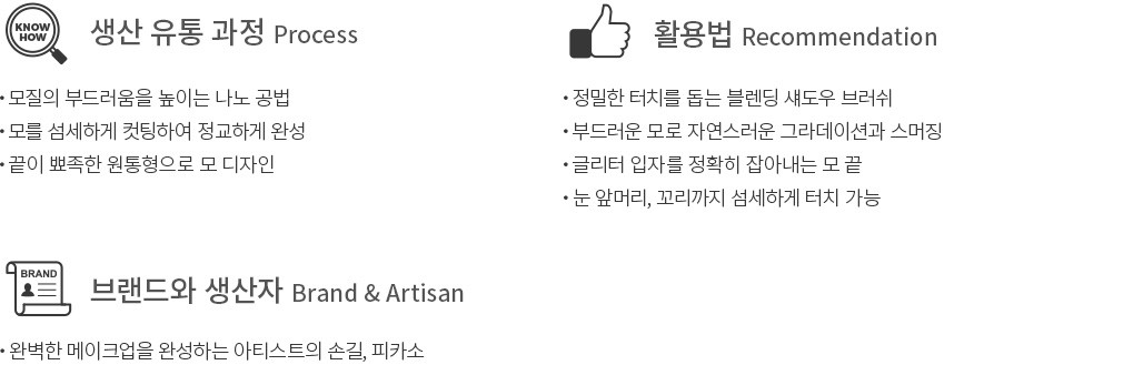 모방할 수 없는 완성도와 내구성 피카소의 브러쉬는 용도에 맞는 고품질의 모를 찾는 것에서 시작합니다. 엄격한 기준으로 선별한 모를 장인들이 직접 섬세하게 컷팅하여 최적의 형태를 완성하고, 예민한 피부에도 부드럽게 닿도록 가공하죠. 편안한 그립감과 정교한 컨트롤이 가능하도록 핸들까지 꼼꼼하게 설계하고 견고하게 완성했습니다. 또 일반적인 브러쉬처럼 모근을 당기는 테스트를 하는 대신, 모근과 모질 자체를 보호하여 오랫동안 사용할 수 있도록 연구하고 있습니다. 그래서 그 품질과 내구성은 하루에도 수많은 메이크업을 하는 전문가들에게 인정을 받고 있죠.