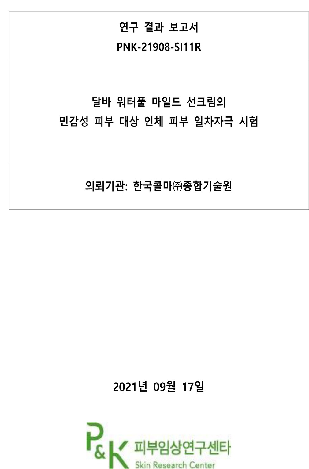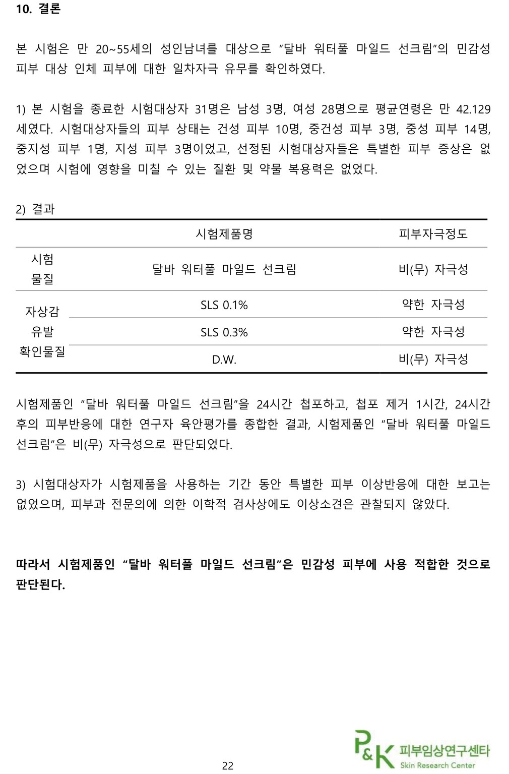 ・ 시험 결과 : 24시간 피부 첩포 테스트 결과, 달바 워터풀 마일드 선크림은 민감성 피부에 사용 적합한 것으로 판단.