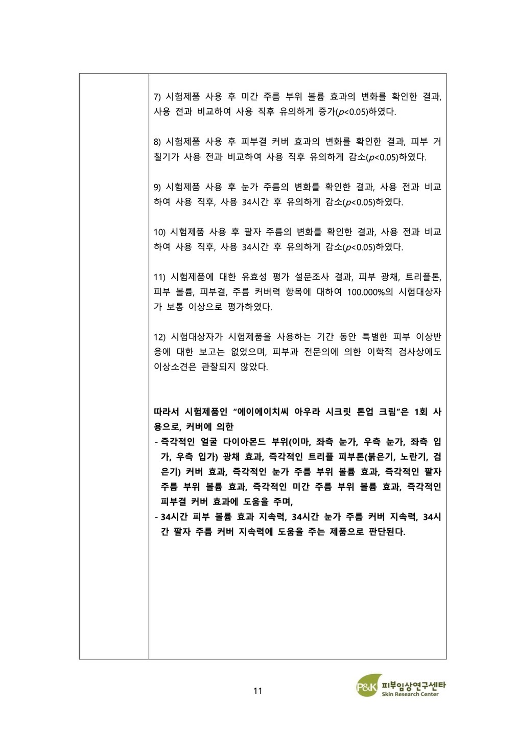 ③즉각적인 얼굴 다이아몬드 부위 광채 효과, 트리플 피부톤 커버 효과, 눈가·팔자·미간 주름 부위 볼륨 효과 등에 도움을 주는 제품으로 판단