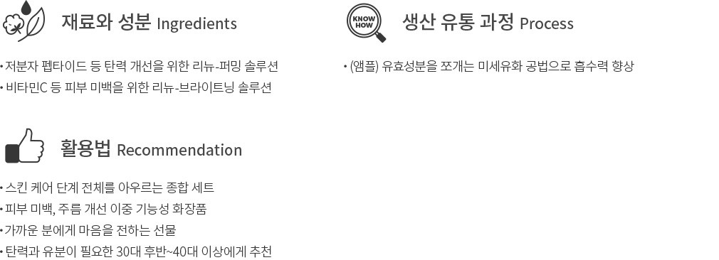 힘을 잃은 피부, 푸석하고 칙칙해진 피부에 원래의 모습을 되찾아줄 AHC의 리뉴 에이지 토탈 세트를 만나보세요. 토너부터 크림까지 바르는 단계 단계마다 피부에 탄력과 화사한 빛을 불어넣어 준답니다. 저분자 펩타이브 성분을 함유해 주름 개선에 도움을 주고요. 쁘띠존 즉, 눈 밑 인디언 주름과 입가의 마리오네트 주름이 고민이었다면 더욱 만족스러울 거예요. 소중한 사람을 위한 특별한 선물로 선택해 보세요.