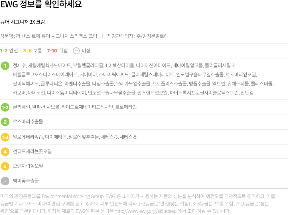 EWG에 대한 컬리의 생각 컬리는 화장품, 샴푸, 치약, 세제 등 우리의 인체에 닿는 리빙 제품의 전성분을 공개하고 성분의 위험 정도를 EWG 기준에 따라 1~10 숫자로 안내하고 있습니다. EWG가 세계적으로 널리 사용되는 신뢰할 수 있는 척도인 것은 맞지만, 상품의 안전성을 증명하는 절대적인 기준은 아니에요. EWG로부터 좋지 못한 평가를 받은 성분에 대해 전문가와 유관기관은 '권고 기준치를 지켜 사용할 경우 무해하다'고 평가하기도 합니다. 이에 컬리는 EWG 등급과 인터넷에 떠도는 단편적인 정보에만 의존하지 않고 식품의약품안전처, 에코서트(ECOCERT), 미국식품의약국(FDA), 미국화장품원료검토위원회(CIR)등 공신력 있는 인증기관의 의견을 참고하여 유해성 여부를 꼼꼼하게 따져 보고 있습니다.