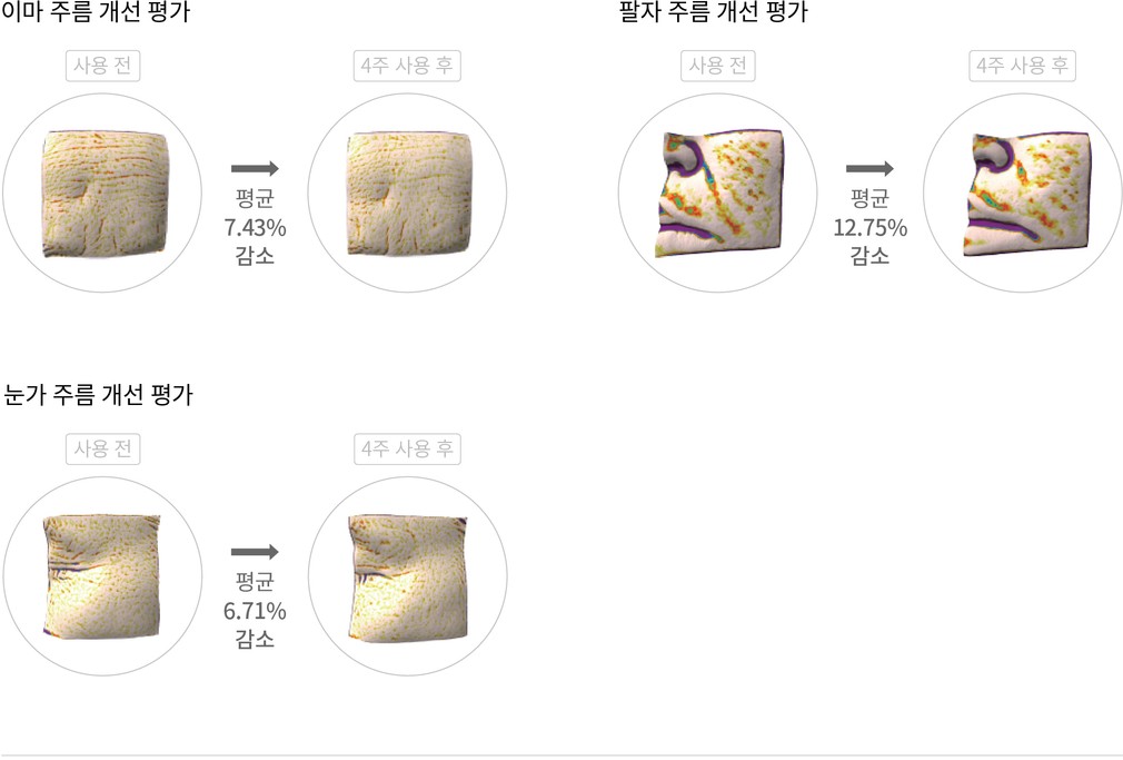①외부 자극(물리적 자극)에 의한 피부 자극 진정 효과 / 피부 보습 100시간 홀딩 효과 / 3종 주름(이마주름, 팔자주름, 눈가주름) 개선에 도움 / 피부 트리플 톤, 피부 탄력, 피부치밀도, 안면 볼 리프팅이 개선되어 안티에이징에 도움을 주는 것으로 판단