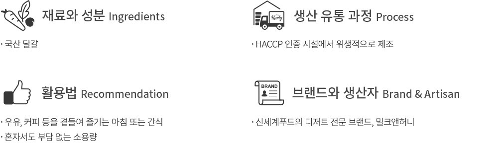- 밀, 우유, 달걀 함유 - 알류, 메밀, 땅콩, 잣, 대두, 고등어, 게, 새우, 돼지고기, 복숭아, 토마토, 아황산류, 호두, 닭고기, 쇠고기, 오징어, 조개류(굴,전복,홍합 포함)를 사용한 제품과 같은 제조시설에서 제조