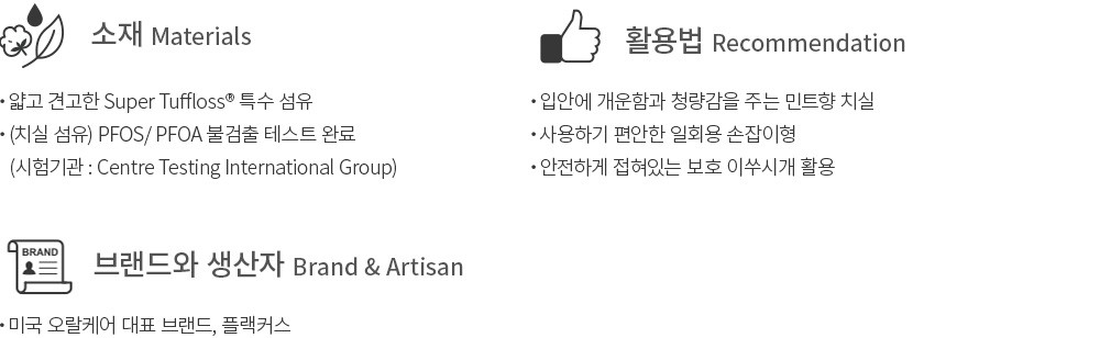 ・특징 : 민트향을 코팅한 얇고 강도 높은 치실로, 구강을 개운하고 청량하게 만들어줍니다.