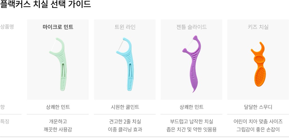 건강한 치아를 유지하려면 양치만으로는 부족하죠. 다양한 구강 위생 용품 중 잇몸에 가장 자극을 주지 않는 것이 바로 치실인데요. 40여 년 전부터 치실을 개발해 온 해외 브랜드, 플랙커스의 치실을 소개할게요. 자체 개발한 Super Tuffloss®* 섬유로 제작되어, 매끄럽고 얇지만 웬만한 힘으로는 늘어나지 않는 견고함을 지닌 치실이에요. 손잡이형이라 편안하게 사용할 수 있고, 어금니에도 수월하게 닿는답니다. 특히 마이크로 민트는 개운하고 상쾌한 사용감으로 플랙커스의 대표 상품으로 자리 잡았으니, 더욱 믿고 선택해보세요.
