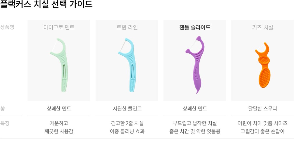 건강한 치아를 유지하려면 양치만으로는 부족하죠. 다양한 구강 위생 용품 중 잇몸에 가장 자극을 주지 않는 것이 바로 치실인데요. 40여 년 전부터 치실을 개발해 온 해외 브랜드, 플랙커스의 치실을 소개할게요. 지금 소개하는 젠틀 슬라이드는 치실을 얇고 납작한 형태로 만들어, 좁은 치간 사이에도 부드럽게 들어가는 것이 장점이에요. 잇몸이 약해서 치실이 닿기만 하면 쉽게 피가 나던 분에게도 자신 있게 권할 수 있죠. 손잡이형이라서 입을 크게 벌리지 않아도 손쉽게 사용할 수 있어 더욱 편안할 거예요.