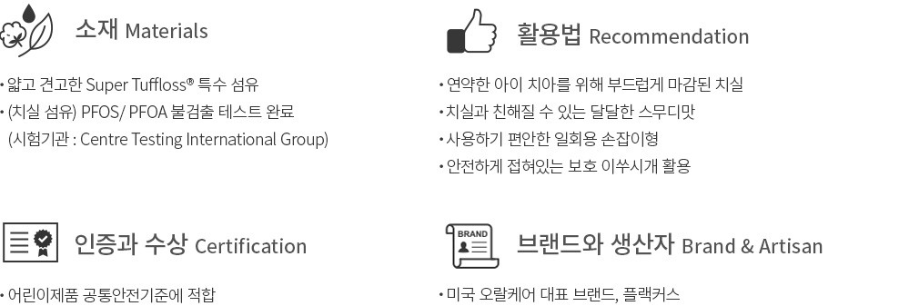 ・특징 : 어린이의 구강구조에 알맞게 설계된 키즈 치실입니다. 달콤한 과일 스무디 맛으로 치실을 처음 사용하는 아이들도 쉽게 적응할 수 있게 도와줘요.