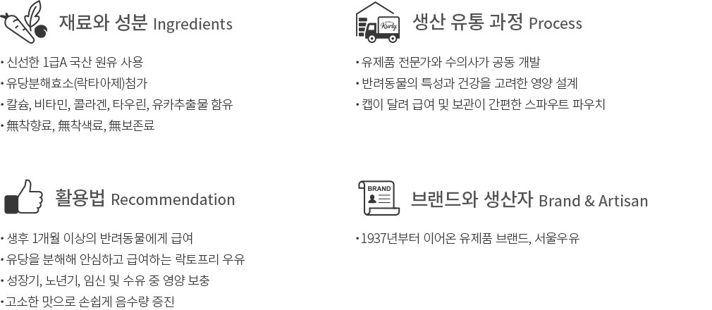 ・특징 : 유당을 제거한 반려동물 전용 우유입니다. 반려견과 반려묘에게 다채로운 영양을 보충해줄 수 있어요.