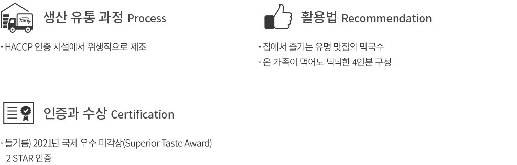 - 대두, 밀, 메밀, 달걀, 쇠고기 함유 - 땅콩, 토마토, 우유, 돼지고기, 닭고기, 새우, 게, 고등어, 오징어, 조개류 혼입가능