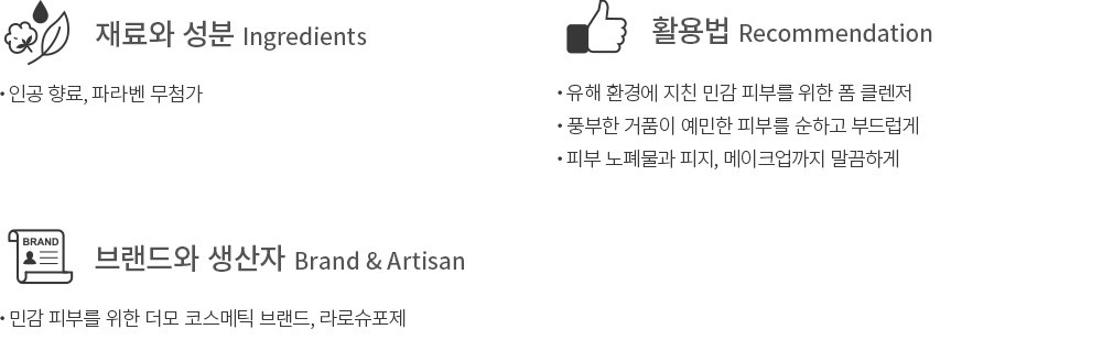 사용법 ・ 미지근한 물을 적신 피부에 부드럽게 마사지한 후, 깨끗이 씻어내세요.