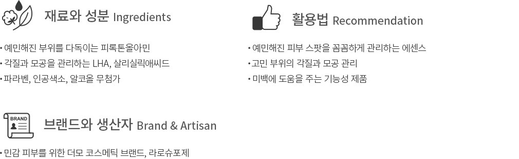 예고도 없이 찾아온 피부 스팟은 라로슈포제의 에빠끌라 A.I. 에센스로 꼼꼼하게 다스려주세요. 먼저 살리실릭애씨드와 LHA 성분인 카프릴로일살리실릭애씨드가 고민 부위의 각질을 부드럽게 녹여주고요. 막힌 모공을 관리해줍니다. 피록톤올아민 성분은 예민해진 부위를 다독여주죠. 나이아신아마이드를 함유한 미백 기능성 제품으로, 피부톤까지 맑게 가꾸어보세요.