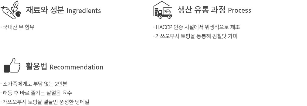- 밀, 메밀, 대두, 고등어 함유 - 알류, 땅콩, 우유, 메밀, 대두, 밀, 고등어, 토마토, 게, 새우, 복숭아, 돼지고기, 아황산류, 호두, 오징어, 쇠고기, 닭고기, 조개류와 같은 시설에서 제조