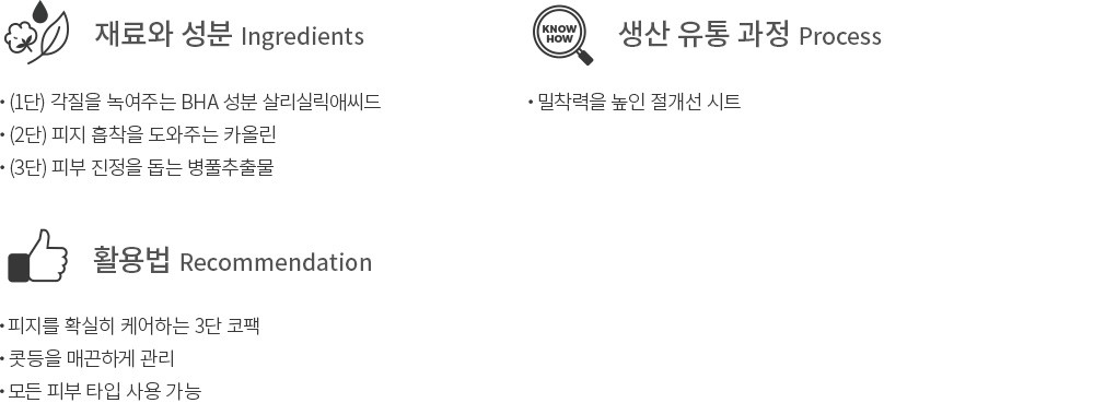 ・살리실릭애씨드 : 피부 모공 속 피지를 비롯해 각질을 녹이는 목적으로 사용하는 성분입니다.