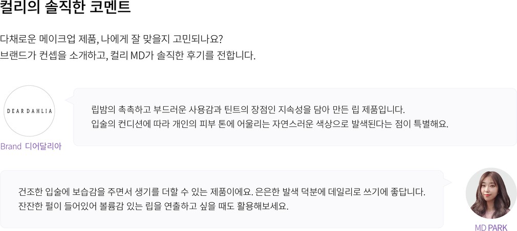 디어달리아는 달리아 꽃에서 영감을 받아 탄생한 비건 메이크업 브랜드입니다. 동물 실험을 하지 않는 것은 물론, 연지벌레 등 색상을 내기 위해 들어가는 동물성 원료까지 철저하게 배제한 비건 제품을 선보이고 있어요. 또 자극이 될 수 있는 성분은 덜어내고, 독자 개발한 다알리아꽃추출물을 담아 피부에 건강한 아름다움을 선사하죠. 멀리서도 한 눈에 알아볼 수 있는 디어달리아만의 팔각형 패키지와 대리석 디자인으로 세련된 감성까지 오롯이 느껴보세요.