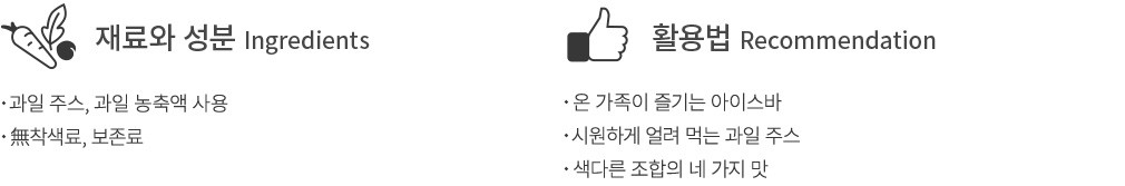보관법 ・빨대를 꽂아 주스처럼 드시려면 실온에서 보관하시고, 얼려서 아이스바로 드시려면 -18℃ 이하의 냉동실에서 3시간 이상 얼려주세요.