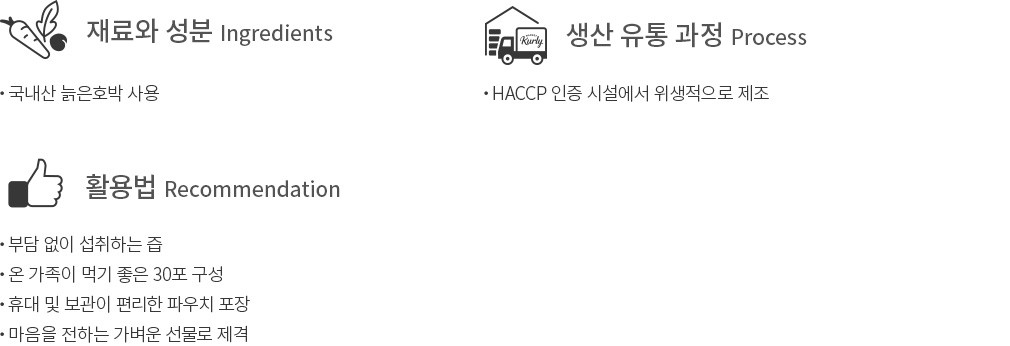 ・특징 : 국내산 늙은호박을 농축시켜 맛과 영양을 그대로 담은 즙이에요. 파우치 형태로 개별 포장하여 휴대 및 보관이 편리해요.