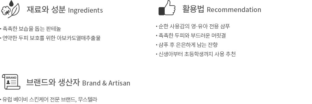 아이의 머리카락이 쑥쑥 자라나기 시작할 때, 무스텔라의 젠틀 샴푸로 세심한 케어를 시작하세요. 식물 유래 성분인 아보카도열매추출물을 담아 촉촉한 두피와 부드러운 머릿결을 유지할 수 있도록 도와준답니다. 작고 조밀한 거품이 두피에 순한 느낌으로 다가와 아이가 머리를 감는 동안 편안함을 느낄 거예요. 모발이 엉키거나 두피의 건조함이 눈에 띌 때, 우리 아이가 만나는 첫 번째 샴푸로 골라보세요.