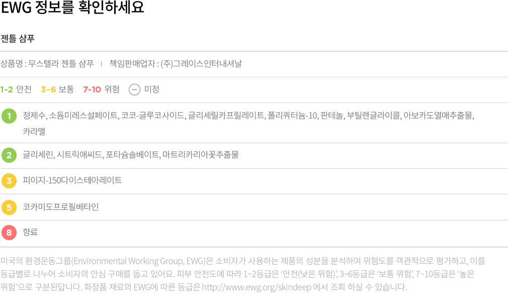 EWG에 대한 컬리의 생각 컬리는 화장품, 샴푸, 치약, 세제 등 우리의 인체에 닿는 리빙 제품의 전성분을 공개하고 성분의 위험 정도를 EWG 기준에 따라 1~10 숫자로 안내하고 있습니다. EWG가 세계적으로 널리 사용되는 신뢰할 수 있는 척도인 것은 맞지만, 상품의 안전성을 증명하는 절대적인 기준은 아니에요. EWG로부터 좋지 못한 평가를 받은 성분에 대해 전문가와 유관기관은 '권고 기준치를 지켜 사용할 경우 무해하다'고 평가하기도 합니다. 이에 컬리는 EWG 등급과 인터넷에 떠도는 단편적인 정보에만 의존하지 않고 식품의약품안전처, 에코서트(ECOCERT), 미국식품의약국(FDA), 미국화장품원료검토위원회(CIR)등 공신력 있는 인증기관의 의견을 참고하여 유해성 여부를 꼼꼼하게 따져 보고 있습니다.