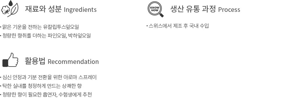・ 향 : 숲 속을 거니는 듯 싱그럽고 상쾌한 전나무 향이 느껴져요.