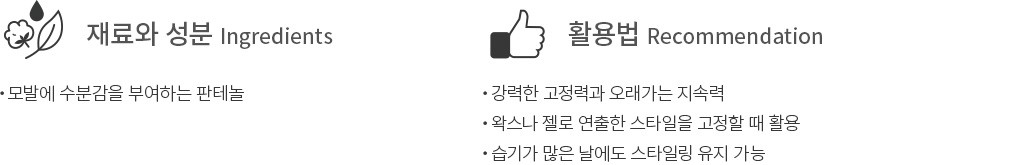 ・사용감 : 뿌리는 즉시 빠르게 건조되어 모발을 강력하게 고정해 줍니다.