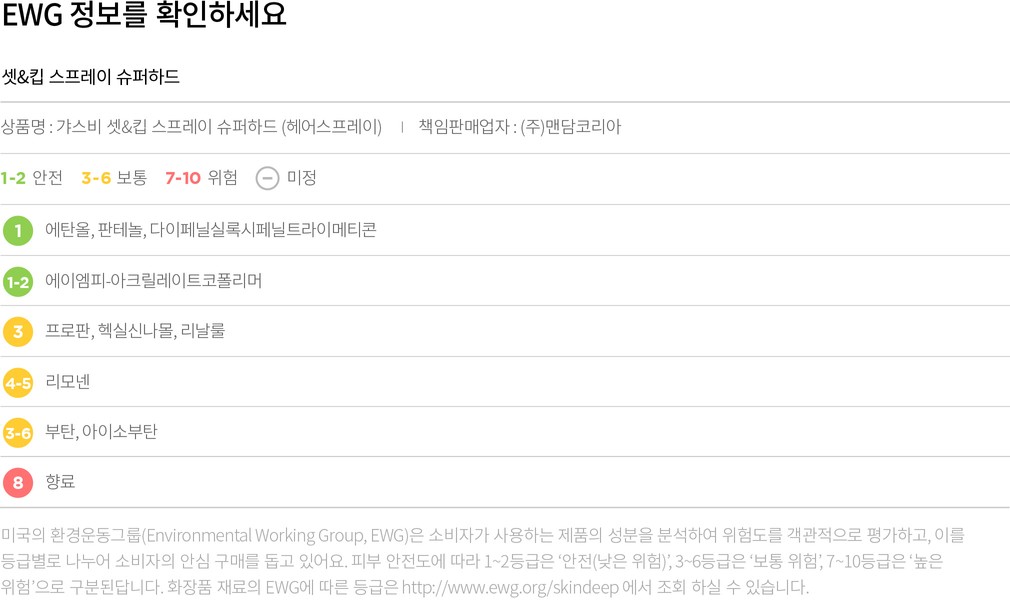 EWG에 대한 컬리의 생각 컬리는 화장품, 샴푸, 치약, 세제 등 우리의 인체에 닿는 리빙 제품의 전성분을 공개하고 성분의 위험 정도를 EWG 기준에 따라 1~10 숫자로 안내하고 있습니다. EWG가 세계적으로 널리 사용되는 신뢰할 수 있는 척도인 것은 맞지만, 상품의 안전성을 증명하는 절대적인 기준은 아니에요. EWG로부터 좋지 못한 평가를 받은 성분에 대해 전문가와 유관기관은 '권고 기준치를 지켜 사용할 경우 무해하다'고 평가하기도 합니다. 이에 컬리는 EWG 등급과 인터넷에 떠도는 단편적인 정보에만 의존하지 않고 식품의약품안전처, 에코서트(ECOCERT), 미국식품의약국(FDA), 미국화장품원료검토위원회(CIR)등 공신력 있는 인증기관의 의견을 참고하여 유해성 여부를 꼼꼼하게 따져 보고 있습니다.