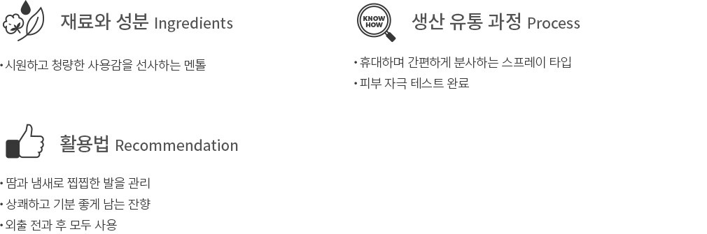 *Tip. 맨발에 뿌리는 것을 권장하며, 땀이 과도하게 나는 경우에는 풋파우더와 함께 사용하세요.