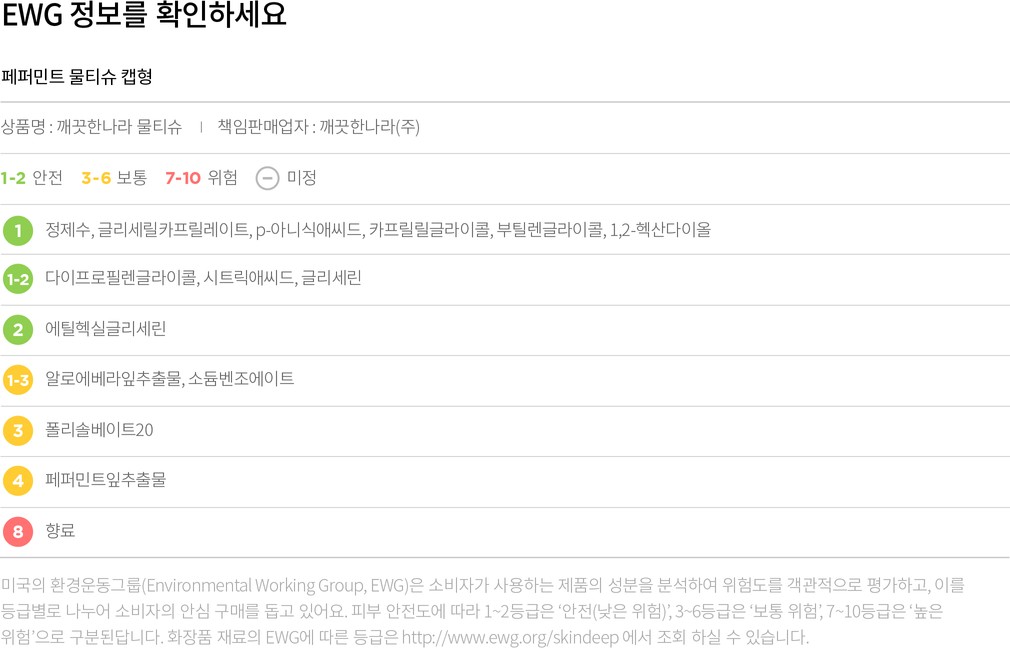 EWG에 대한 컬리의 생각 컬리는 화장품, 샴푸, 치약, 세제 등 우리의 인체에 닿는 리빙 제품의 전성분을 공개하고 성분의 위험 정도를 EWG 기준에 따라 1~10 숫자로 안내하고 있습니다. EWG가 세계적으로 널리 사용되는 신뢰할 수 있는 척도인 것은 맞지만, 상품의 안전성을 증명하는 절대적인 기준은 아니에요. EWG로부터 좋지 못한 평가를 받은 성분에 대해 전문가와 유관기관은 '권고 기준치를 지켜 사용할 경우 무해하다'고 평가하기도 합니다. 이에 컬리는 EWG 등급과 인터넷에 떠도는 단편적인 정보에만 의존하지 않고 식품의약품안전처, 에코서트(ECOCERT), 미국식품의약국(FDA), 미국화장품원료검토위원회(CIR)등 공신력 있는 인증기관의 의견을 참고하여 유해성 여부를 꼼꼼하게 따져 보고 있습니다.