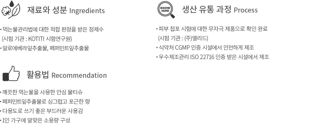 ・특징 : 페퍼민트잎추출물이 함유되어 더욱 산뜻한 사용감의 물티슈예요. 캡형으로 보관과 사용도 편리합니다.