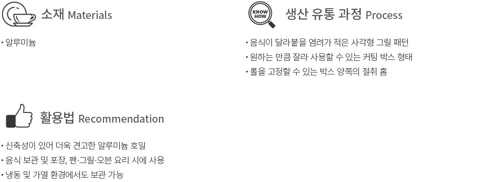 ・특징 : 쫀쫀한 신축성으로 찢어질 염려를 덜 수 있는 알루미늄 호일입니다. 음식을 가볍게 보관하거나 포장할 때는 물론 팬이나 그릴, 오븐 요리 시에도 사용해보세요.