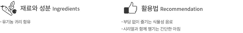 ・특징 : 유기농 귀리 본연의 고소함을 살린 음료예요. 텁텁함 없이 깔끔한 맛으로 누구나 즐기기 좋답니다.