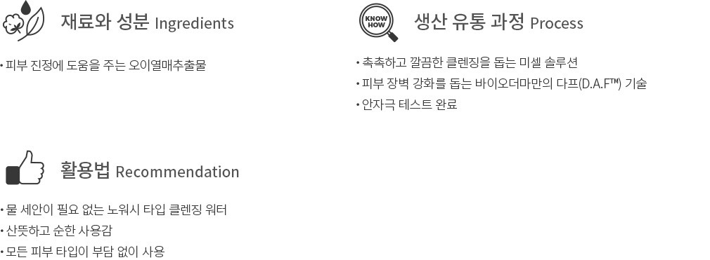 이렇게 사용하세요 ・ 메이크업이나 노폐물을 지우고자 할 때 화장솜에 충분히 적셔 피부 결을 따라 부드럽게 닦아주세요.