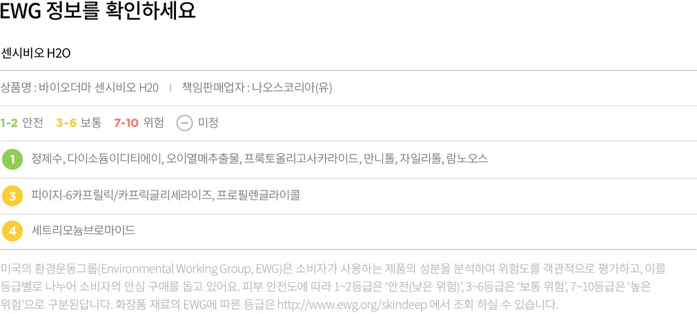 컬리는 EWG로부터 보통, 위험 등급을 받은 성분이라 하더라도 숨기지 않고 정직하게 공개합니다. 더불어 우려되는 성분에 대한 정보를 함께 제공해 드리오니 구입 전 반드시 확인해 주세요.