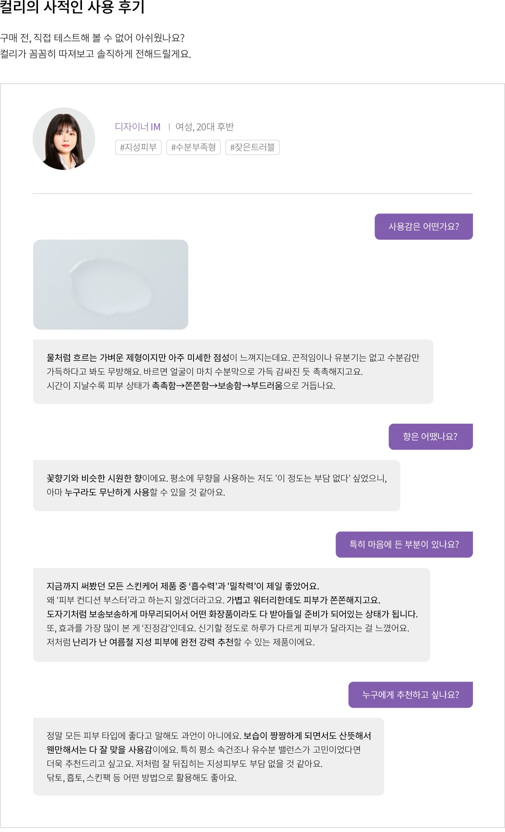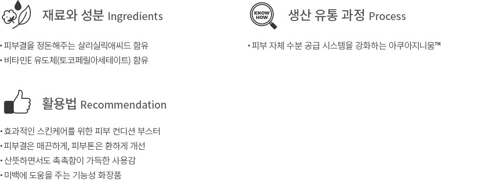 이 제품이 에센스도 로션도 아닌 ‘에센스 로션’인 이유는 발라보면 알 수 있어요. 에센스처럼 묽지만 웬만한 로션에 견주어도 부족함 없을 만큼 피부의 컨디션을 확 끌어올려 주기 때문이에요. 수분감을 가득 채워줌은 물론, 피부의 결을 정돈해주고 환하게 밝혀주기까지 하니 ‘피부 컨디션 부스터’, ‘수분 광채 로션'으로 불릴만하답니다.