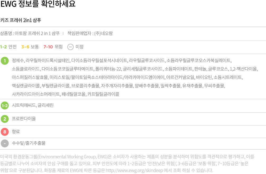 컬리는 EWG로부터 보통, 위험 등급을 받은 성분이라 하더라도 숨기지 않고 정직하게 공개합니다. 더불어 우려되는 성분에 대한 정보를 함께 제공해 드리오니 구입 전 반드시 확인해 주세요.