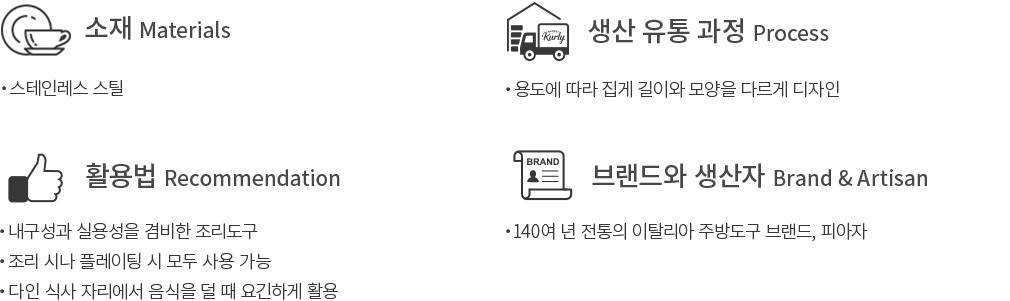 피아자는 1880년에 설립된 이탈리아의 주방도구 제조 브랜드입니다. ‘원재료의 선별이 품질의 핵심이다’라는 철학 아래 이탈리아산 스테인리스 원재료만을 사용해, 현대적인 디자인과 탄탄한 내구성을 함께 갖춘 제품들을 선보이고 있죠. 그중에서도 스테인리스 집게 제품 라인은 동종업계의 트렌드를 선도하며, 전 세계로 그 가치와 위상을 떨치고 있답니다. 세계적인 전문 셰프들로부터 꾸준히 각광받아 온 오랜 전통의 키친툴을 이제 컬리에서 만나보세요.