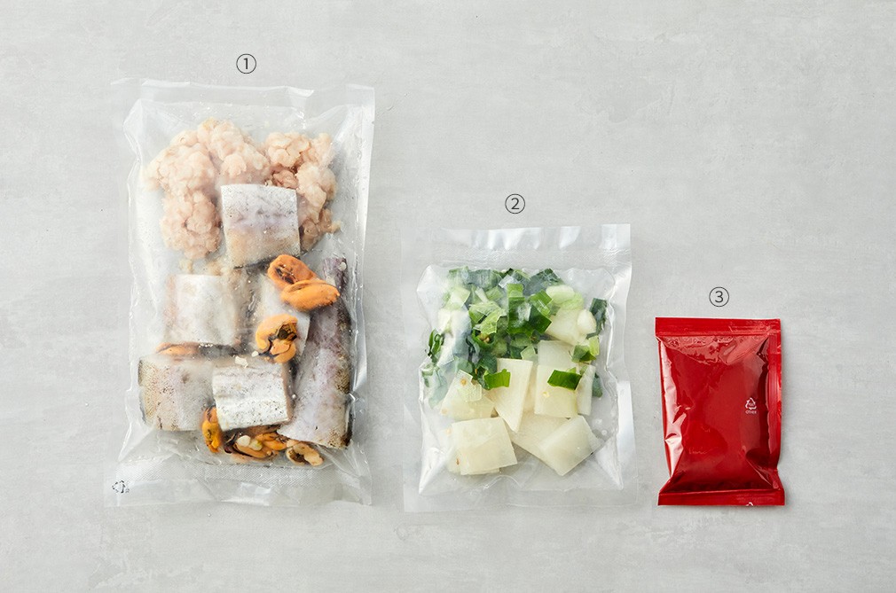 - 우유, 대두, 밀, 게, 닭고기, 새우, 쇠고기, 오징어, 조개류(굴, 홍합, 바지락, 개량조개) 함유 - 이 제품은 알류, 메밀, 땅콩, 고등어, 돼지고기, 복숭아, 토마토, 아황산류, 호두, 조개류(전복 포함), 잣을 사용한 제품과 같은 제조시설에서 제조