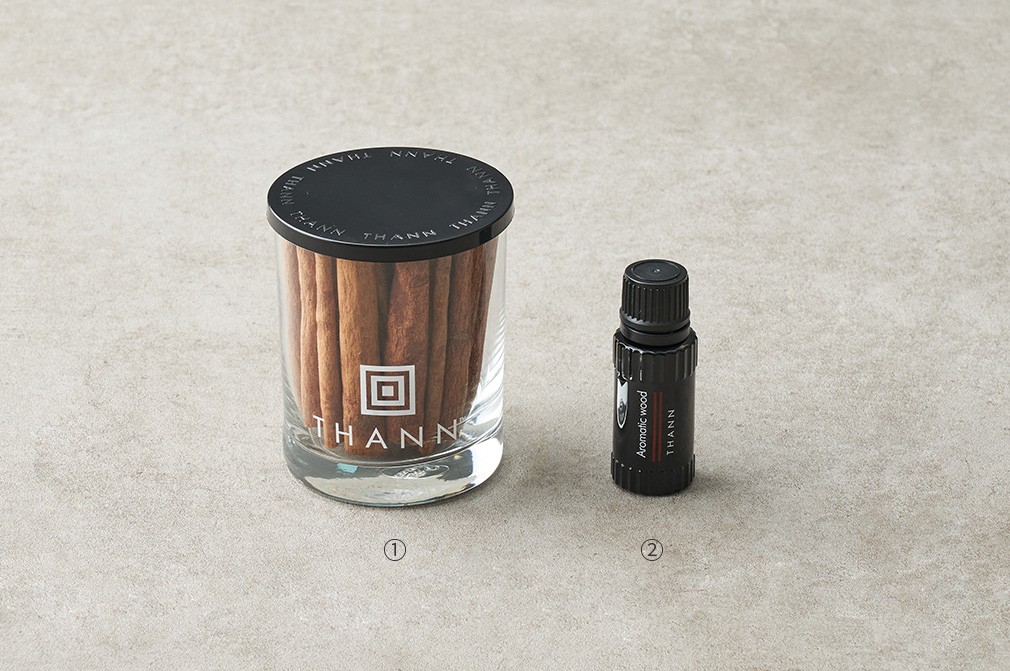 아로마틱 우드 에센셜 오일 ・구성 : ①시나몬 스틱, ②에센셜 오일