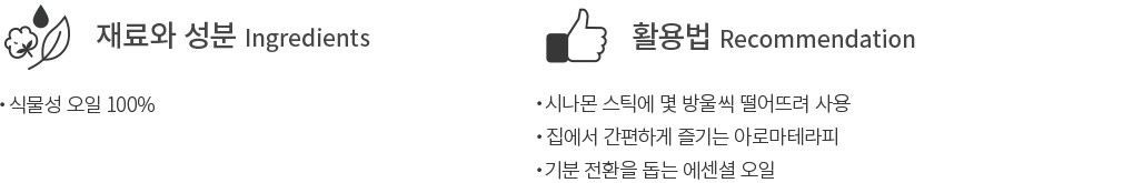 사용법 ・시나몬스틱에 3~5방울 정도 떨어뜨려 실내 공간에 놓으면 향이 피어 올라요.