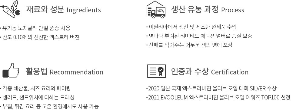 ・특징 : 발연점이 높아 튀김을 포함한 다양한 가열 요리에 활용이 가능한 엑스트라버진 올리브오일입니다. 강렬한 풍미가 느껴지지만, 씁쓸한 맛과 매캐한 향이 적절히 어우러져 부담 없이 즐기기 좋아요.