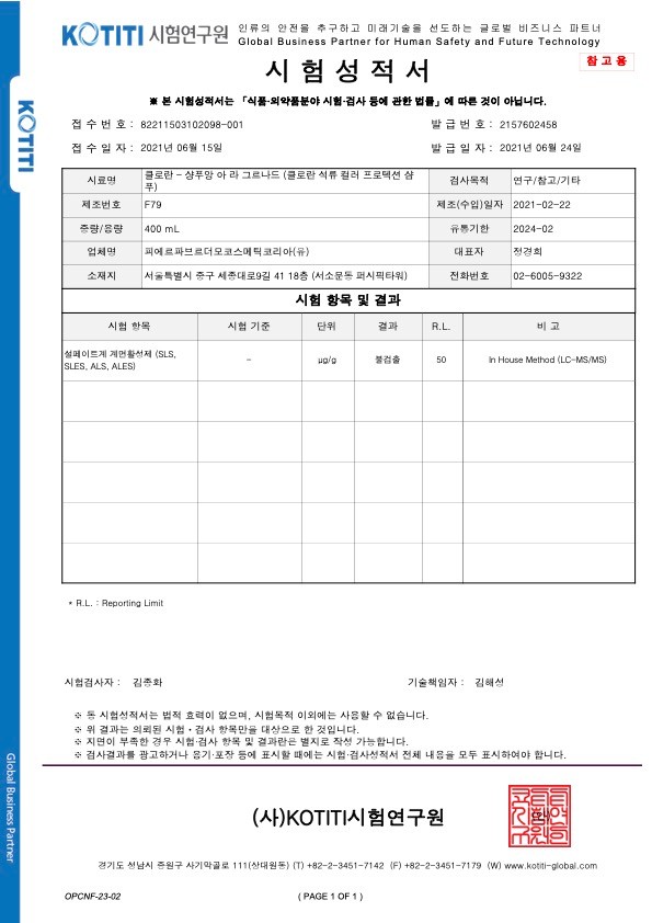 ・시험 결과 : 설페이트계 계면활성제(SLS, SLES, ALS, ALES) 불검출