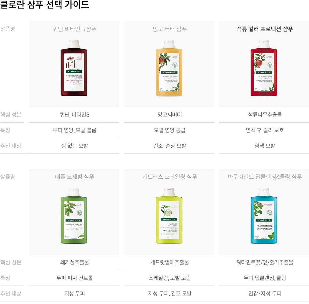 염색을 하고 나면 컬러 유지와 손상된 모발 개선에 관심이 생기기 마련이죠. 관리에 더욱 신경 써야 하는 만큼, 염색모를 위한 클로란의 샴푸를 사용해보세요. 모발 착색 유지를 위한 석류 추출물 사용*으로 염색모의 색소가 쉽게 빠지지 않고요. 약산성이라 염색으로 인해 알칼리화된 모발을 건강하게 가꾸어준답니다. 색을 지키고 모발까지 케어해주는 똑똑한 샴푸로 염색 모발을 관리해보세요.