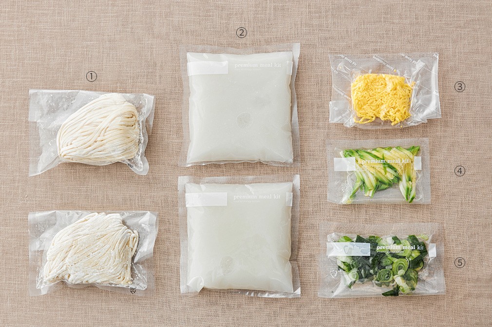 ・구성 : ①칼국수 면(2팩), ②한우 육수(2팩), ③계란 지단(1팩), ④애호박(1팩), ⑤대파(1팩)