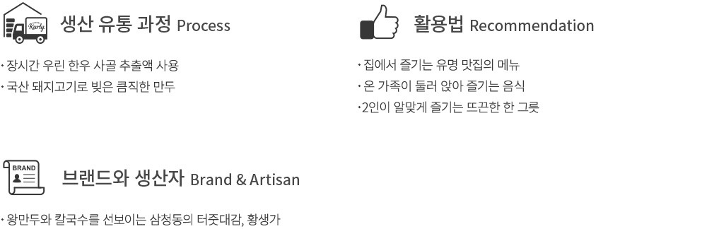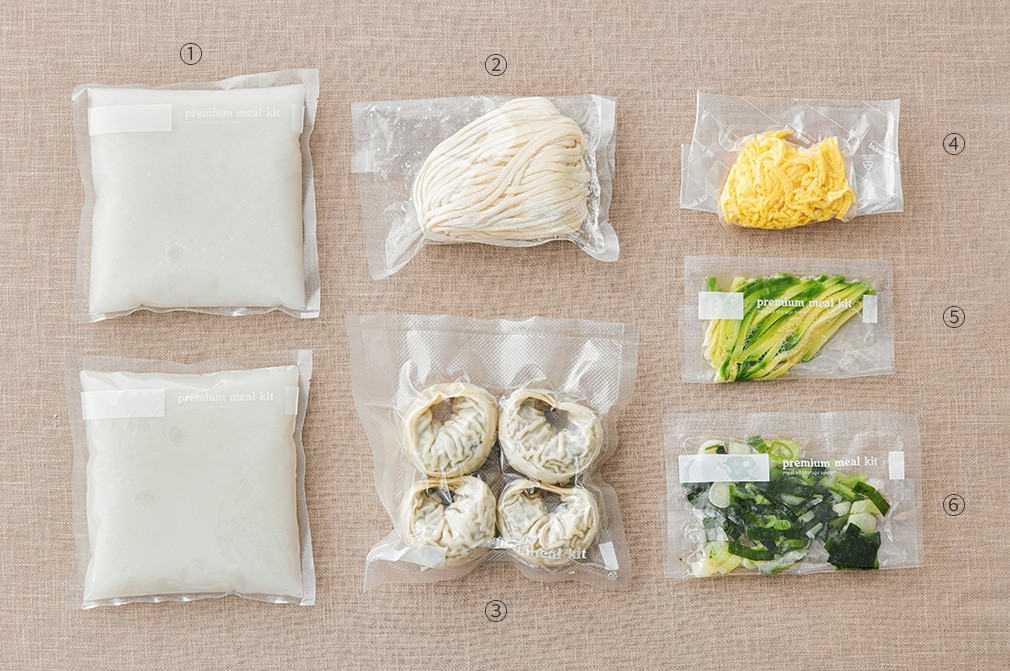 ・구성 : ①한우 육수(2팩), ②칼국수 면(1팩), ③만두(1팩), ④계란 지단, ⑤애호박, ⑥대파