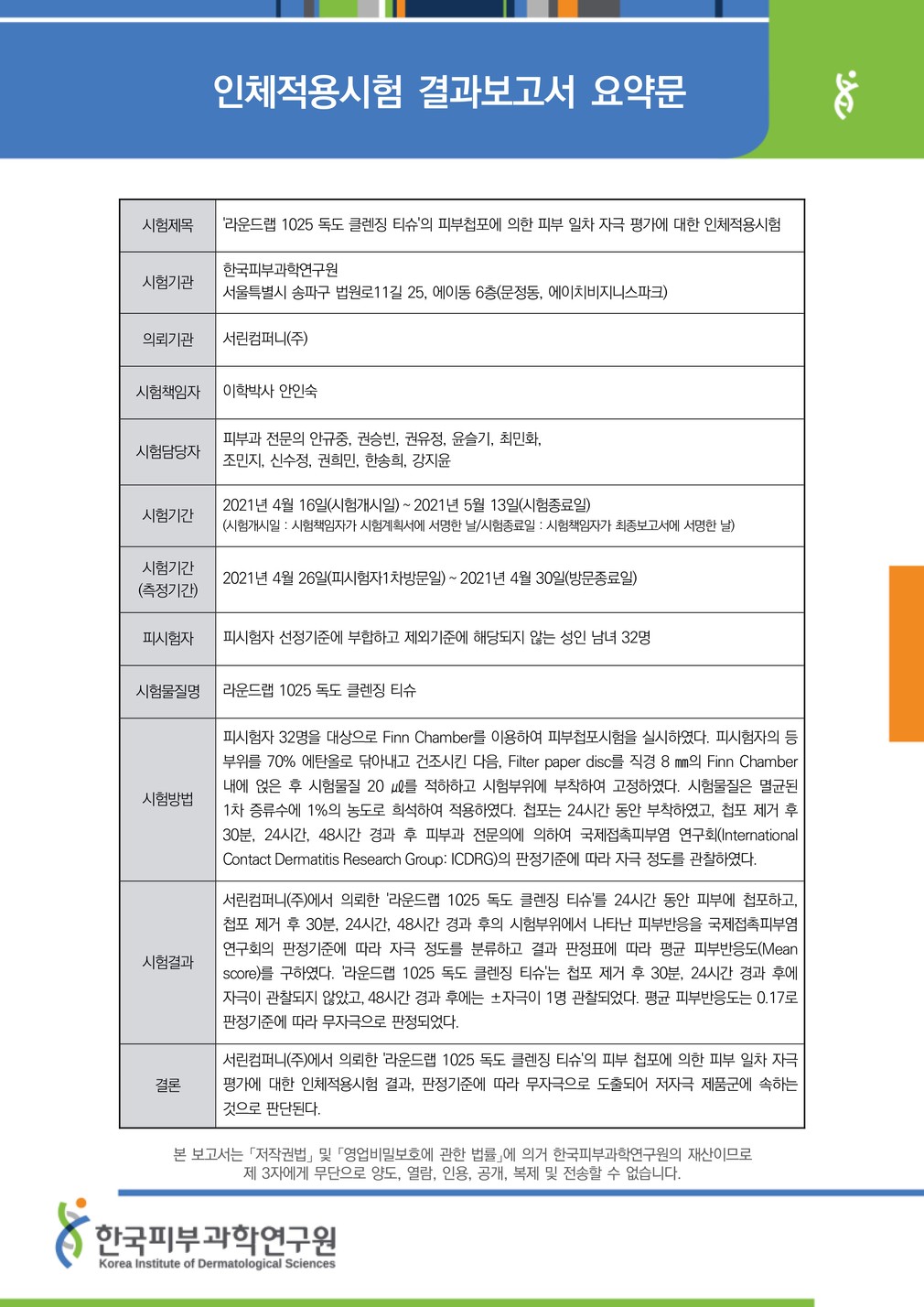 성적서를 확인하세요 ・ 시험 기관 : 한국피부과학연구원
