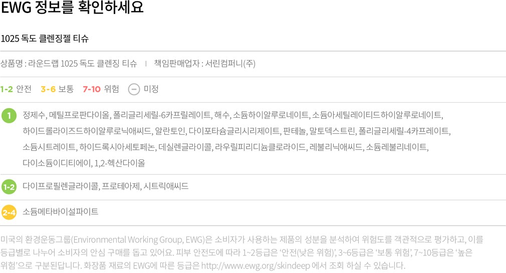 컬리는 EWG로부터 보통, 위험 등급을 받은 성분이라 하더라도 숨기지 않고 정직하게 공개합니다. 더불어 우려되는 성분에 대한 정보를 함께 제공해 드리오니 구입 전 반드시 확인해 주세요.